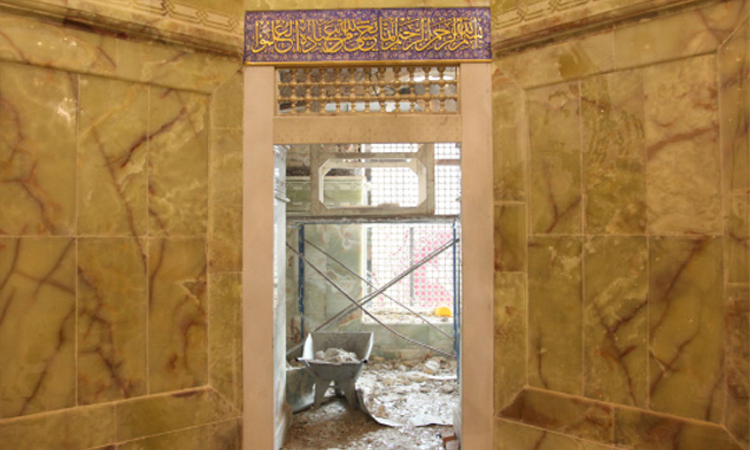 حيث تم رفع المرمر القديم للجدران والارضية داخل المقبرة ثم حفر الارضية بمنسوب (50سم) تحت مستوى أرضية الحرم.