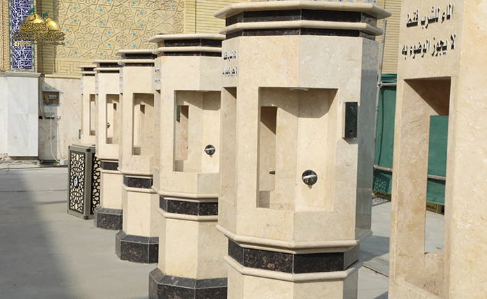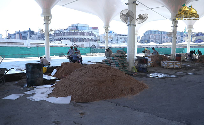 وأضاف: أما عن طبيعة مواد الإكساء حيث تم اختيار أجود انواع مرمر والكرانيت ذو جودة عالية وبقياسات مختلفة، وبسُمك (٤ سم) للأرضية، كما أُجريت عليه الفحوصات من ناحية قوة التحمّل، وثباتية اللون ومقدار الامتصاص، ومدى تأثره بدرجات الحرارة العالية، فضلاً عن تثبيت القطع المرمرية بشكل دقيق ومتناسق في غاية الجمال والروعة والإبداع.