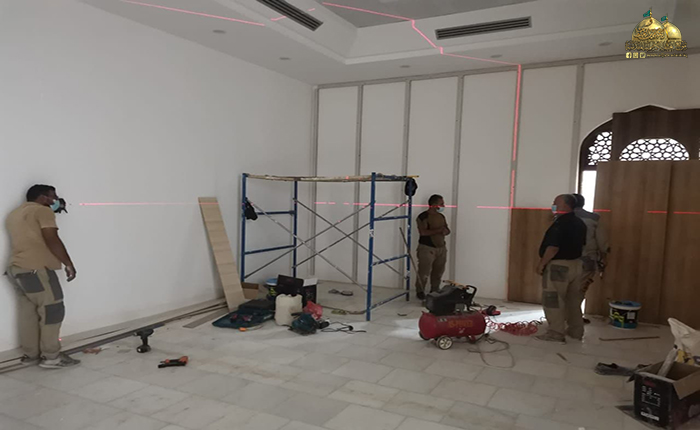 أما فيما يخص سقوف القاعة حيث تم تغييرها من خلال استخدام الألواح الجبسية، والسقوف الثانوية بناءً على متطلبات معمارية حيث امتزجت في تلك الأشكال الفنية ثقافة العمارة الإسلامية والتراث الأصيل بإبداع الهندسة العصرية الحديثة، كذلك تم إجراء تعديلات لمختلف الخدمات والمنظومات الموجودة في القاعة منها نظام الإنارة المستخدم من خلال تراكيب جديدة حققت النسق العلمي المطلوب الذي يتناسب مع حجم وتصميم القاعة وكانت هذه الأعمال بجهود ذاتية مباركة مقدّمةً من قبل مهندسي وفنيي شعبة الهندسة الكهربائية في العتبة المقدسة.